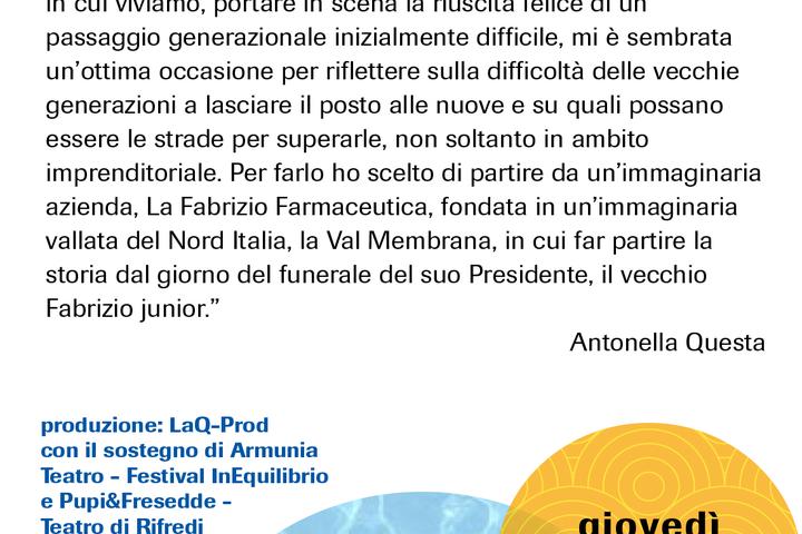 “L’85% delle aziende italiane sono familiari, occupano il 70% dei lavoratori e sono in Europa le più longeve in assoluto. In assoluto - l’80% - sono anche quelle che in Europa mantengono il management in mano ai membri della propria famiglia. Purtroppo, solo il 30% sopravvive al fondatore e soltanto un piccolo 18% arriva alla terza generazione. Essendo da anni la Famiglia il mio campo di indagine preferito, per raccontare e capire la società in cui viviamo, portare in scena la riuscita felice di un passaggio generazionale inizialmente difficile, mi è sembrata un’ottima occasione per riflettere sulla difficoltà delle vecchie generazioni a lasciare il posto alle nuove e su quali possano essere le strade per superarle, non soltanto in ambito imprenditoriale. Per farlo ho scelto di partire da un’immaginaria azienda, La Fabrizio Farmaceutica, fondata in un’immaginaria vallata del Nord Italia, la Val Membrana, in cui far partire la storia dal giorno del funerale del suo Presidente, il vecchio Fabrizio junior.”