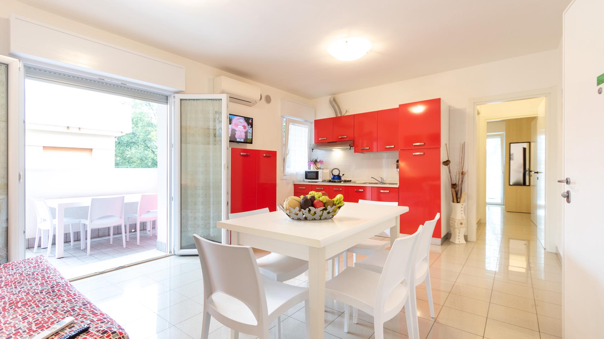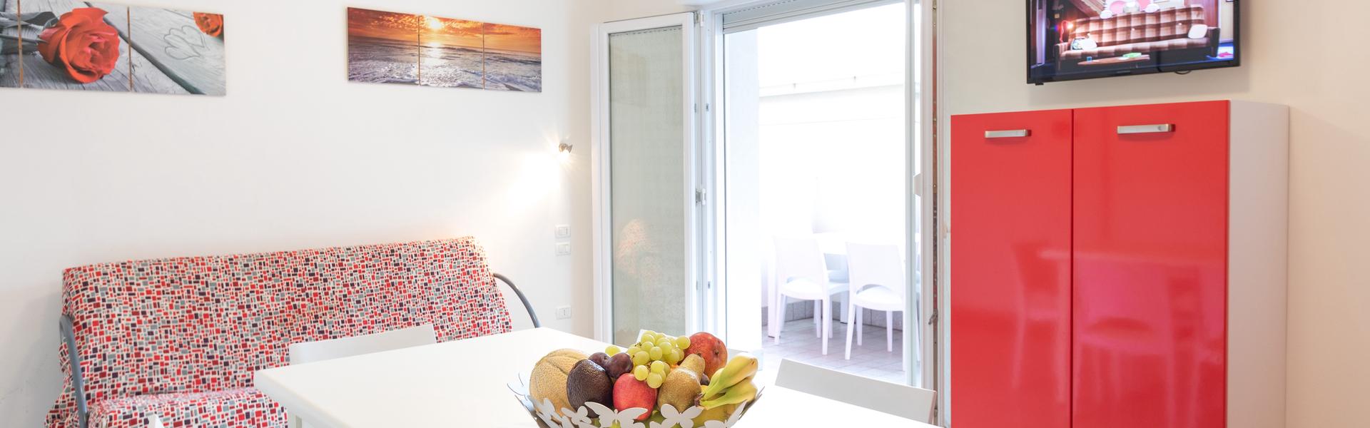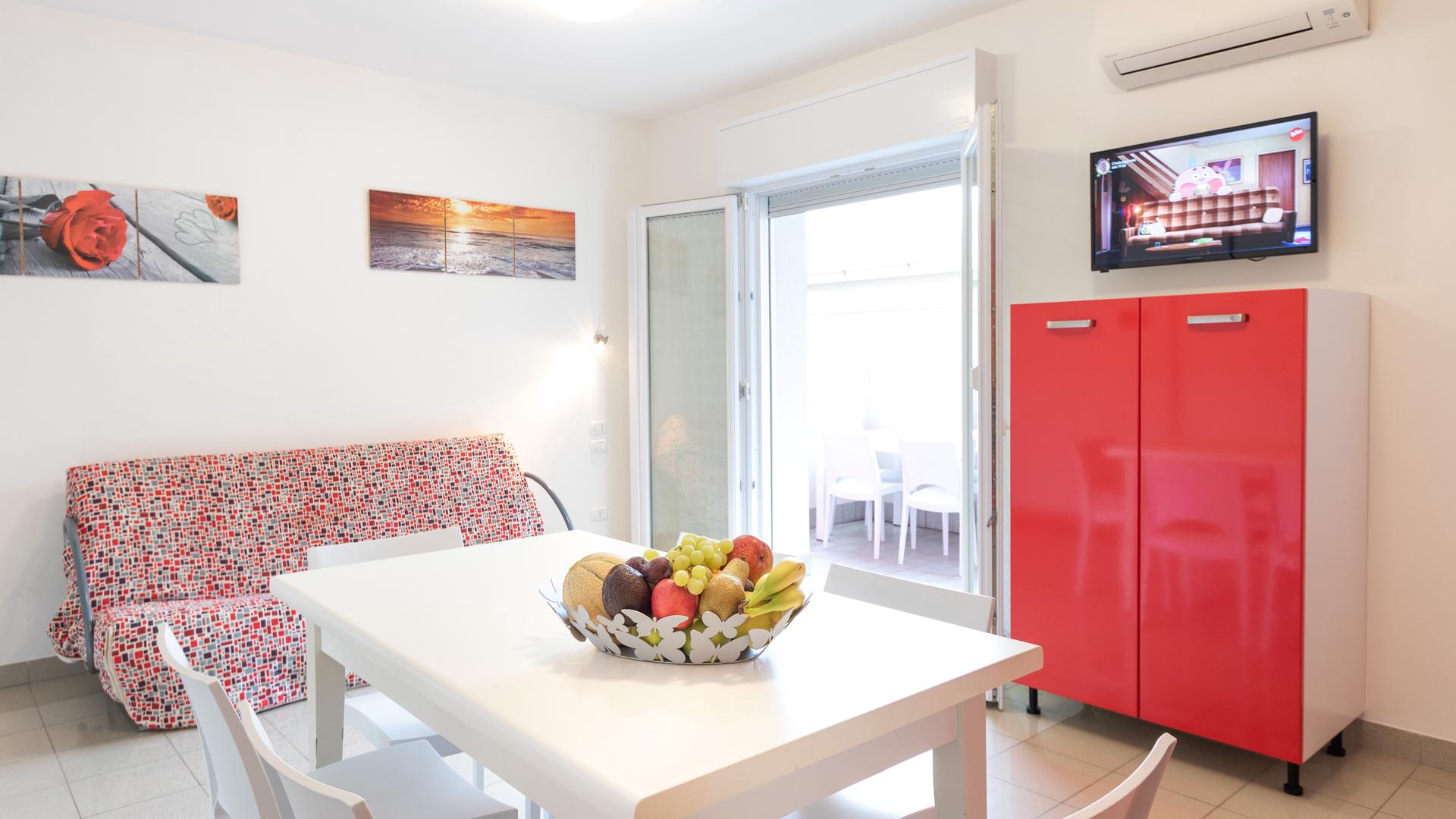 Two-room apartments for 5 people in the new Villa Lucchese consist of one room with double bed and single bed, living room with kitchenette and sofa bed, bathroom with shower, large terrace with table and chairs for the exclusive use. Villa Lucchese is a newly built residence inspired by the famous Dutch painter Mondrian, all apartments are equipped with air conditioning, satellite TV, new modern furniture, security door, parking, wi-fi, the top floor is a large terrace with sun loungers and deck chairs.