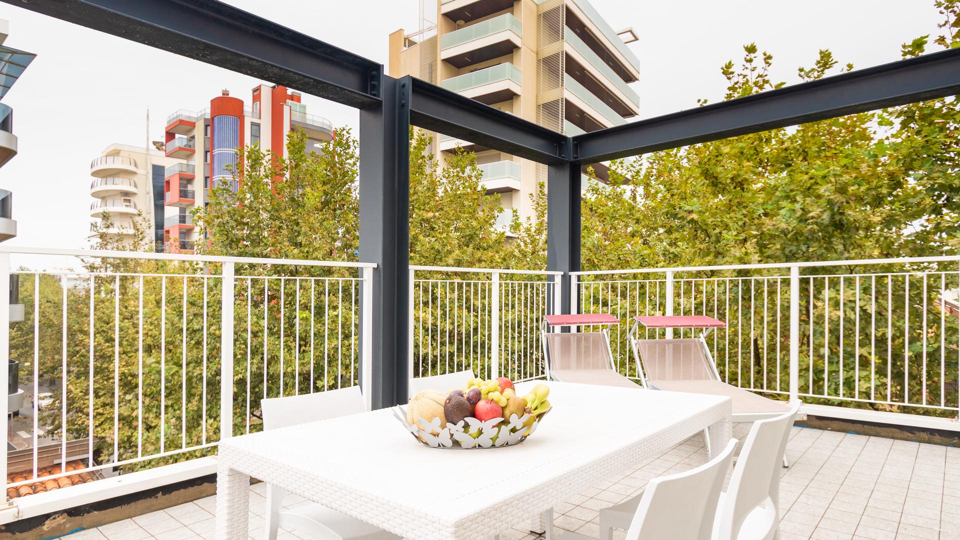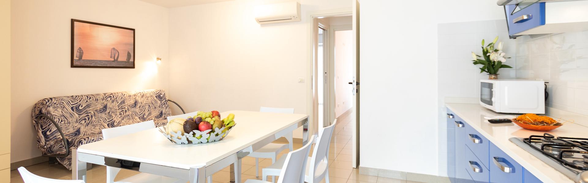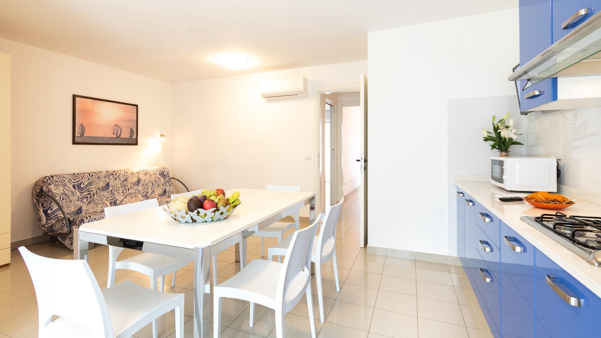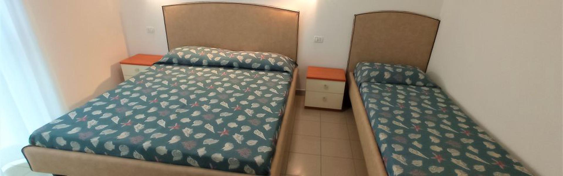 The three-room apartments for 7 people in the new Villa Lucchese consist of a large living room with sofa bed and kitchenette, a double bedroom, second bedroom with double bed elected single, bathroom with shower, large terrace equipped with tables and chairs. Villa Lucchese is a newly built residence, inspired by the famous Dutch painter Mondrian, all apartments are equipped with separate air-conditioning in every room, satellite TV, new modern furniture, security door, parking, wi-fii, intercom, at last floor there is a large terrace with sunbeds and deck chairs.